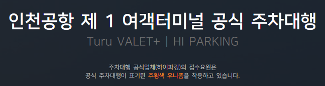 인천공항 1여객터미널의 공식 주차대행업체는 (주)하이파킹입니다. 성수기 등 주차대행 접수 집중 시 현장접수가 제한될 수 있으므로 사전 예약을 권장드립니다.