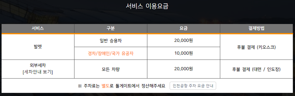 | 발레파킹 서비스 요금 | 20,000원 |