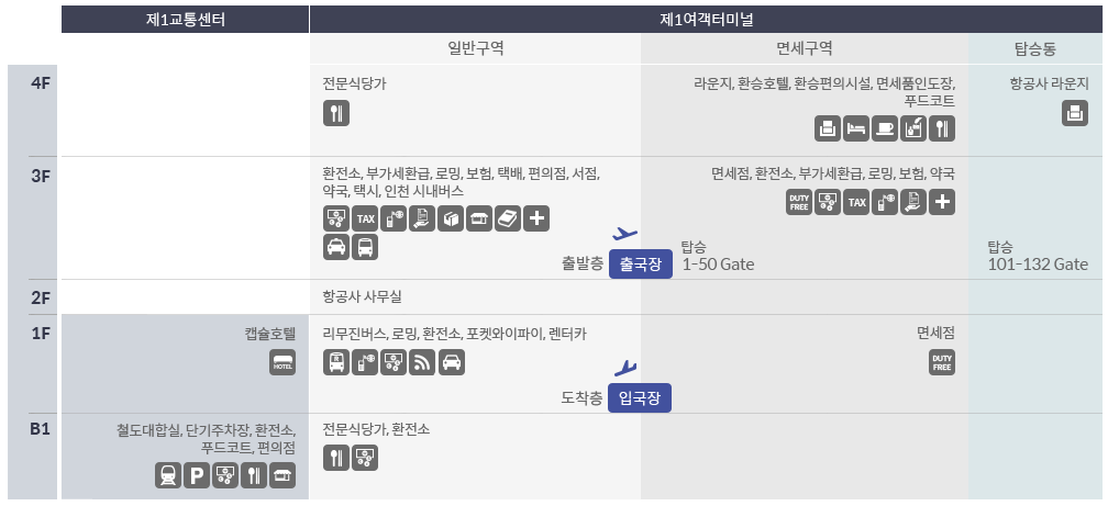 Q: 제1여객터미널 내에서 편의시설을 이용하려면 어떻게 해야 하나요?